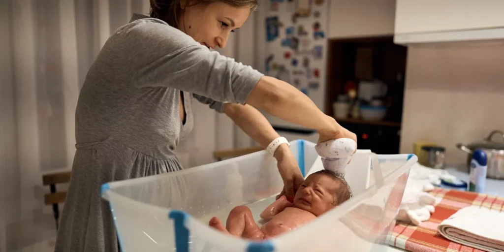 For a safe bath time experience with your newborn, always check the water temperature before placing them in the tub. Use a thermometer to ensure it's around 100°F (37.8°C), similar to body temperature. Test it on your wrist or the inside of your elbow to confirm it's not too hot or cold.